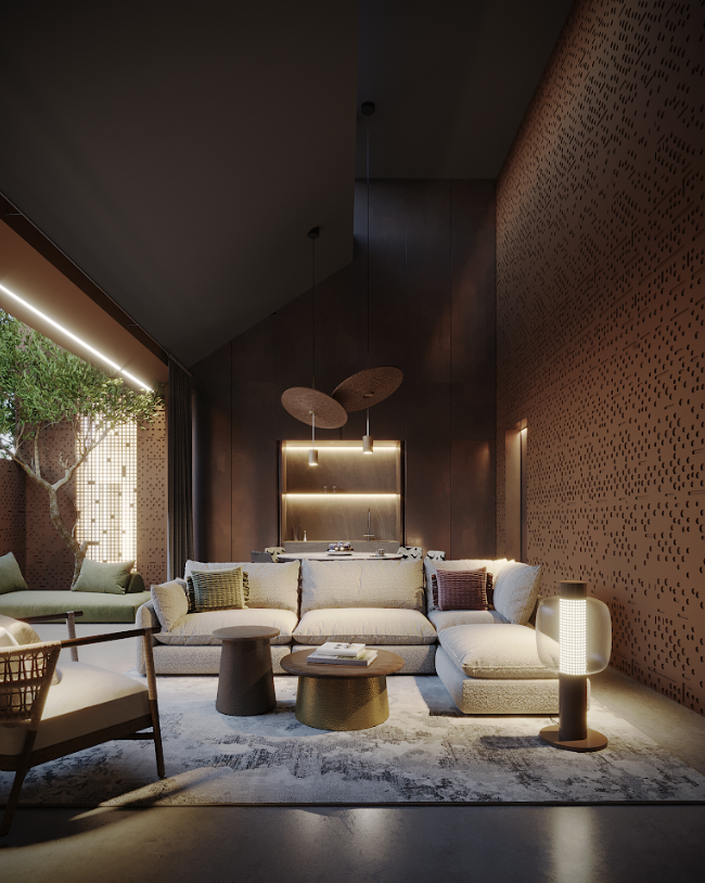Designed in Desert Modernism with Moroccan and dune-inspired motifs, the architecture blends naturally with the surroundings: only 700 meters to the ocean (about a 3-minute walk), with spacious landscaped green areas around. The project is surrounded by 5 hectares of walking green zones.