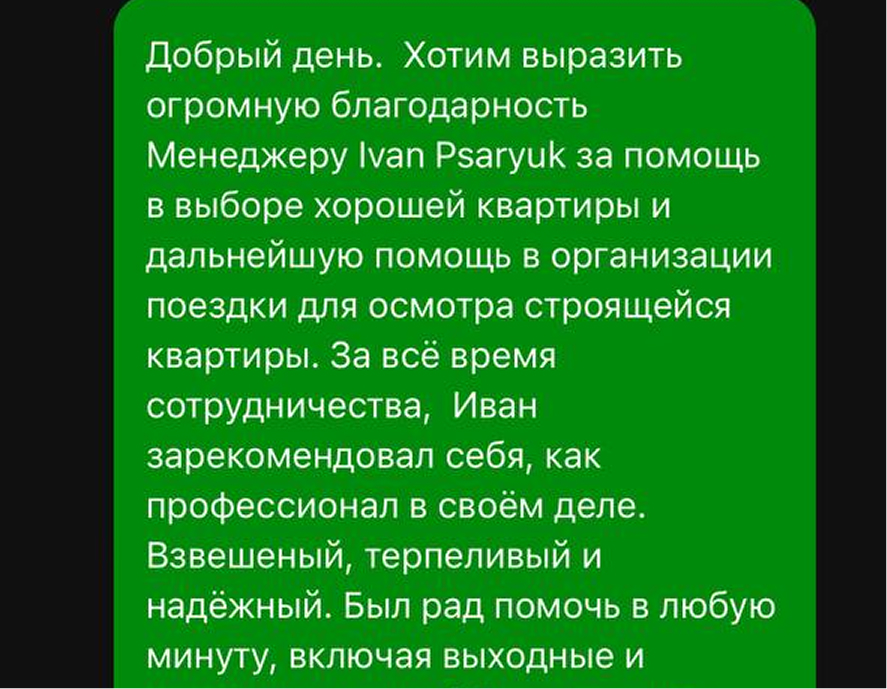 Я хочу выразить свою искреннюю благодарность Ивану за высокий уровень обслуживания. Весь процесс работы с ним был приятным и безупречным. Иван всегда был на связи, что очень важно для меня. Его профессионализм и внимание к деталям заслуживают похвалы. Я была приятно удивлена его приветливым и вежливым отношением ко мне как клиенту. Я без колебаний рекомендую его как профессионала своему окружению и надеюсь на дальнейшее сотрудничество. Благодарю