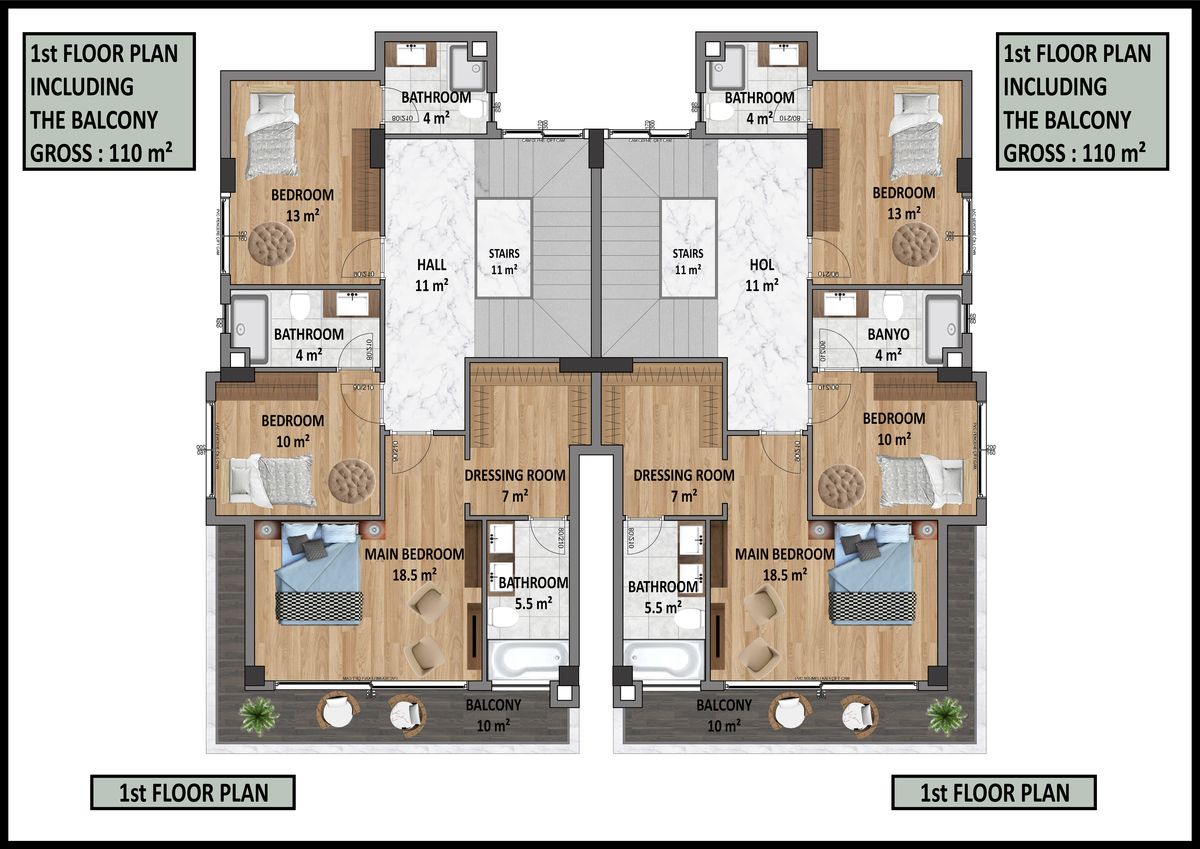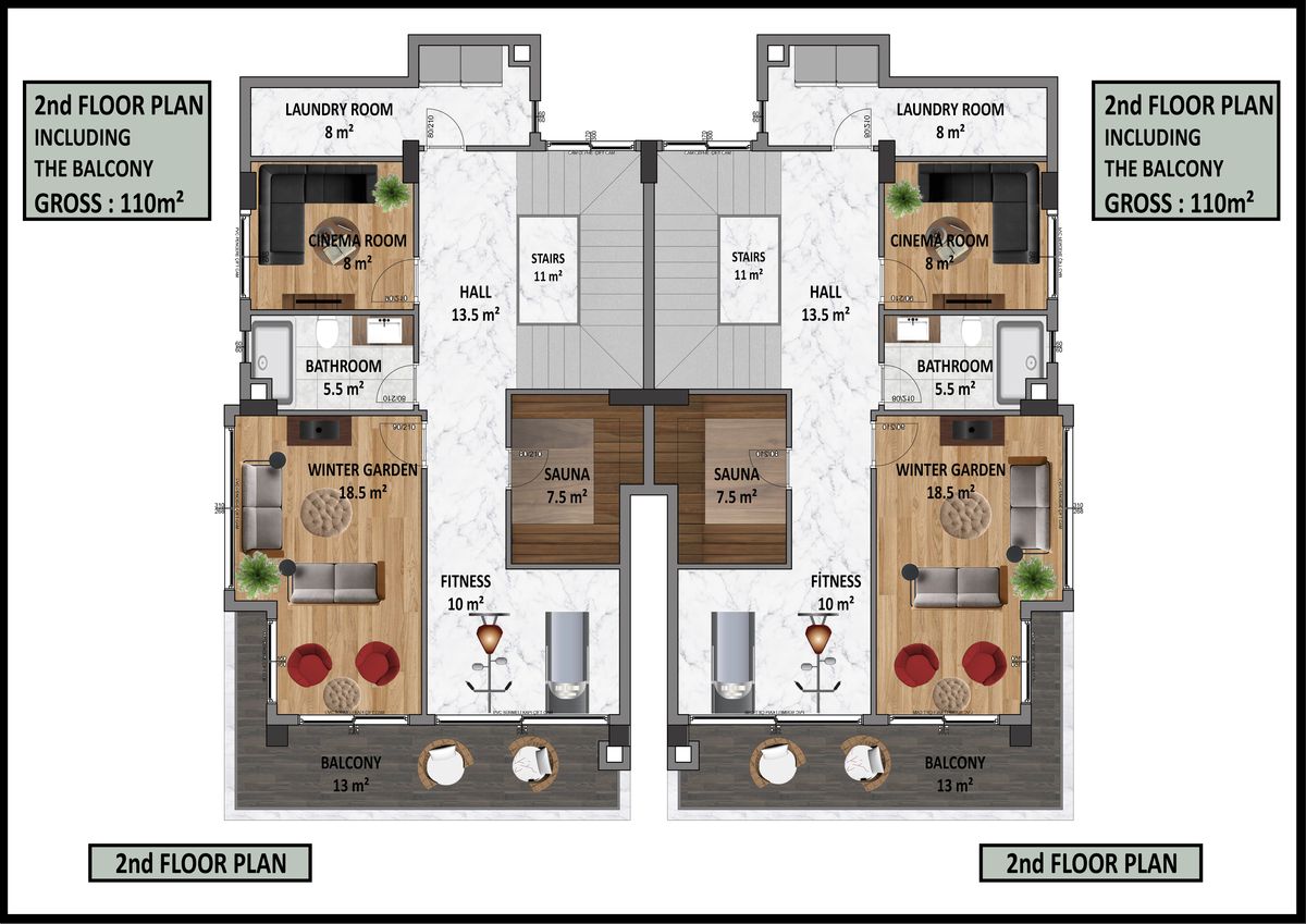 Проект, построенный на большой территории и включающий в себя 7 вилл, имеет общую площадь здания 420 м2 и площадь сада 330 м2. Каждая вилла имеет большой сад и собственный бассейн. Кроме того, к услугам гостей круглосуточные камеры видеонаблюдения, личная охрана и частная парковка.