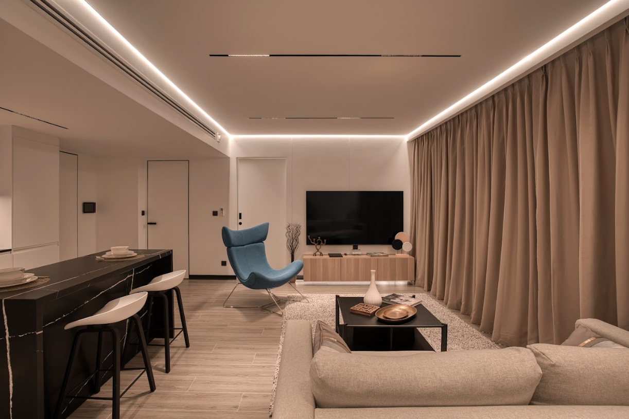 Характерная особенность проектов этого застройщика — использование современных технологий и систем «умный дом». В комплексе установлена центральная система кондиционирования с климат-контролем для поддержания комфортной влажности, потолочное освещение, роботизированные шторы, встроенные беспроводные зарядки в мебели и система контроля стекол.