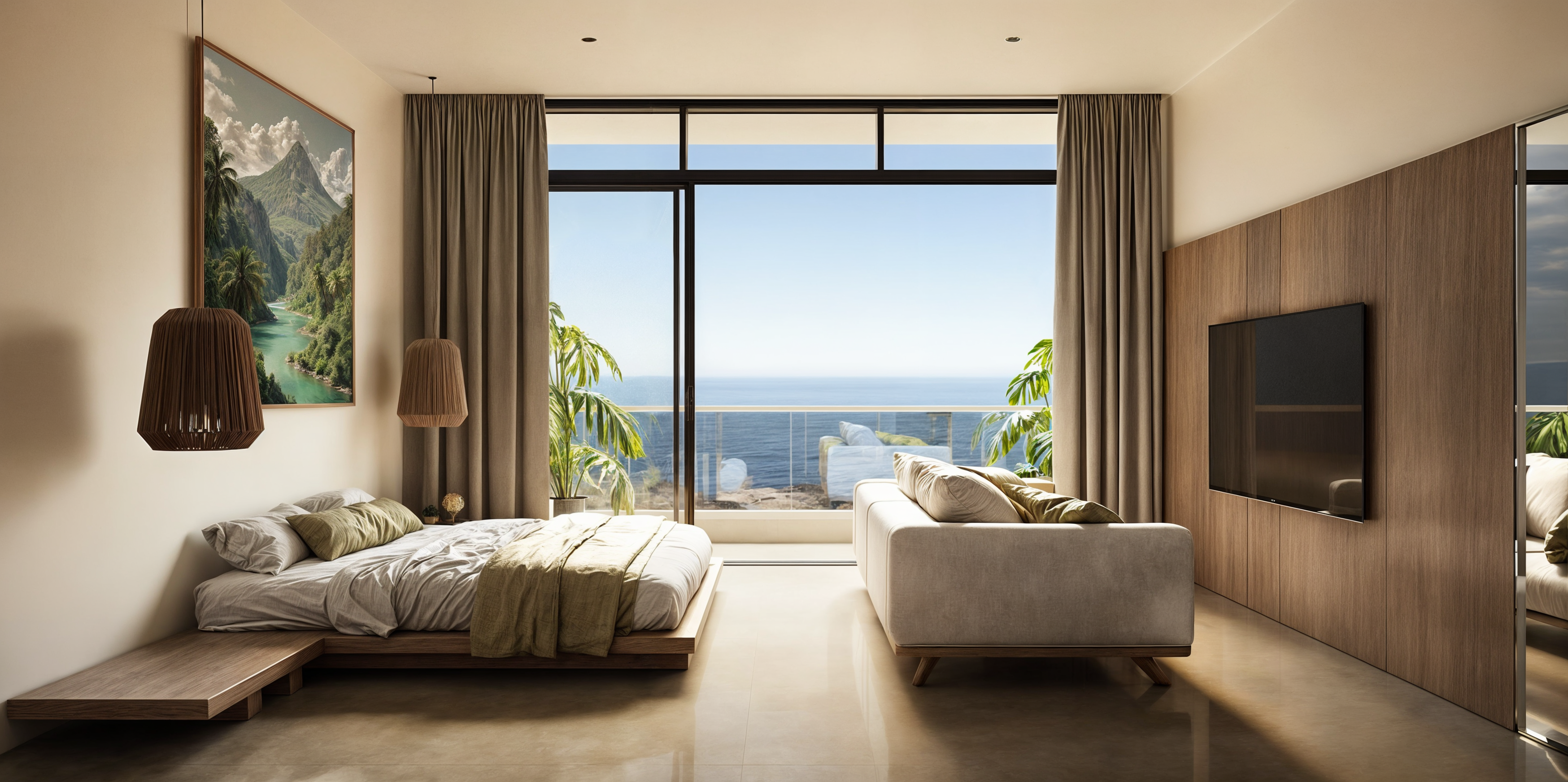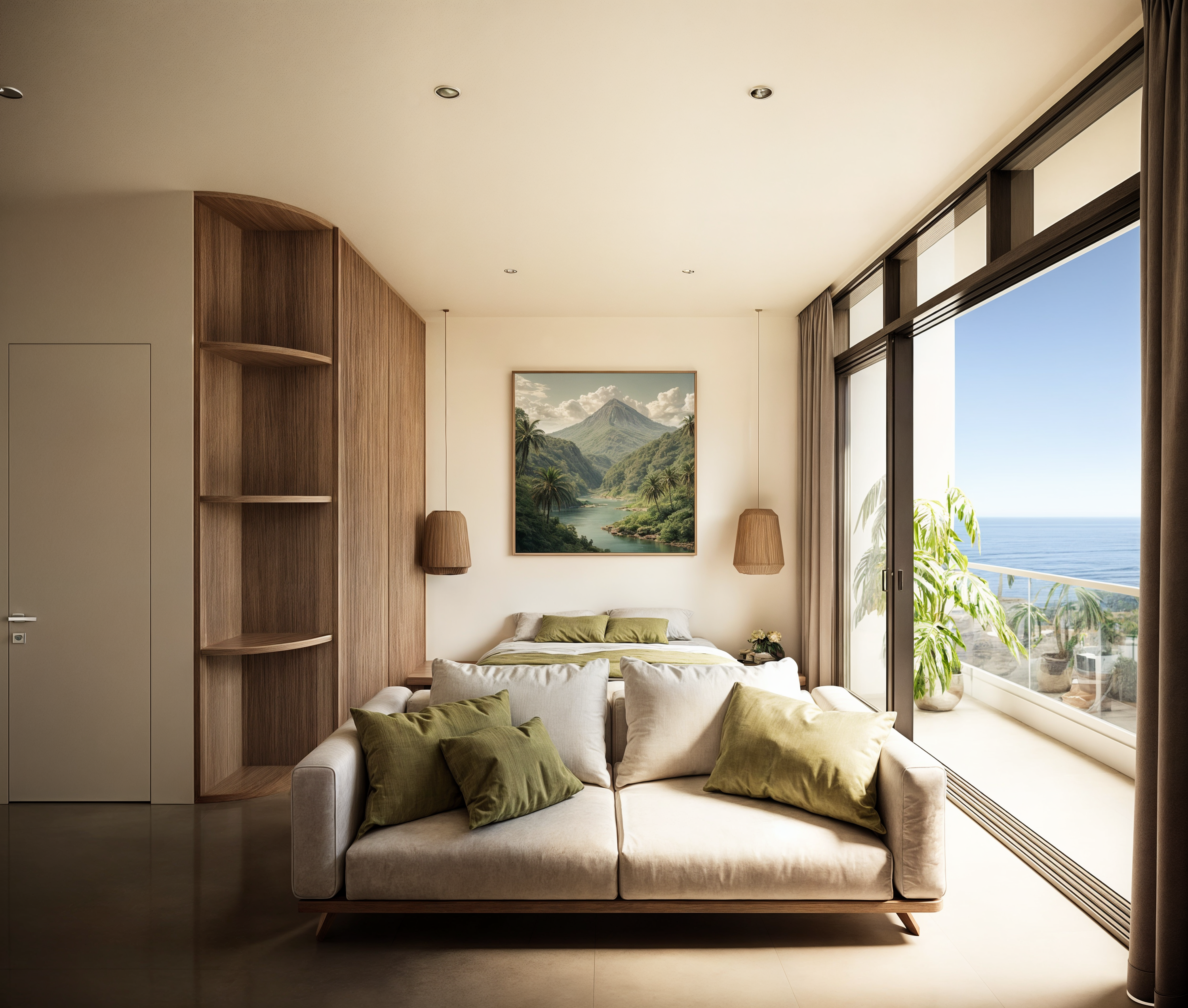 Современные апартаменты с балийским акцентом и панорамными окнами на залив. Эргономичная планировка, наполненность светом и приватные балконы. Идеальны для личного отдыха или краткосрочной аренды.