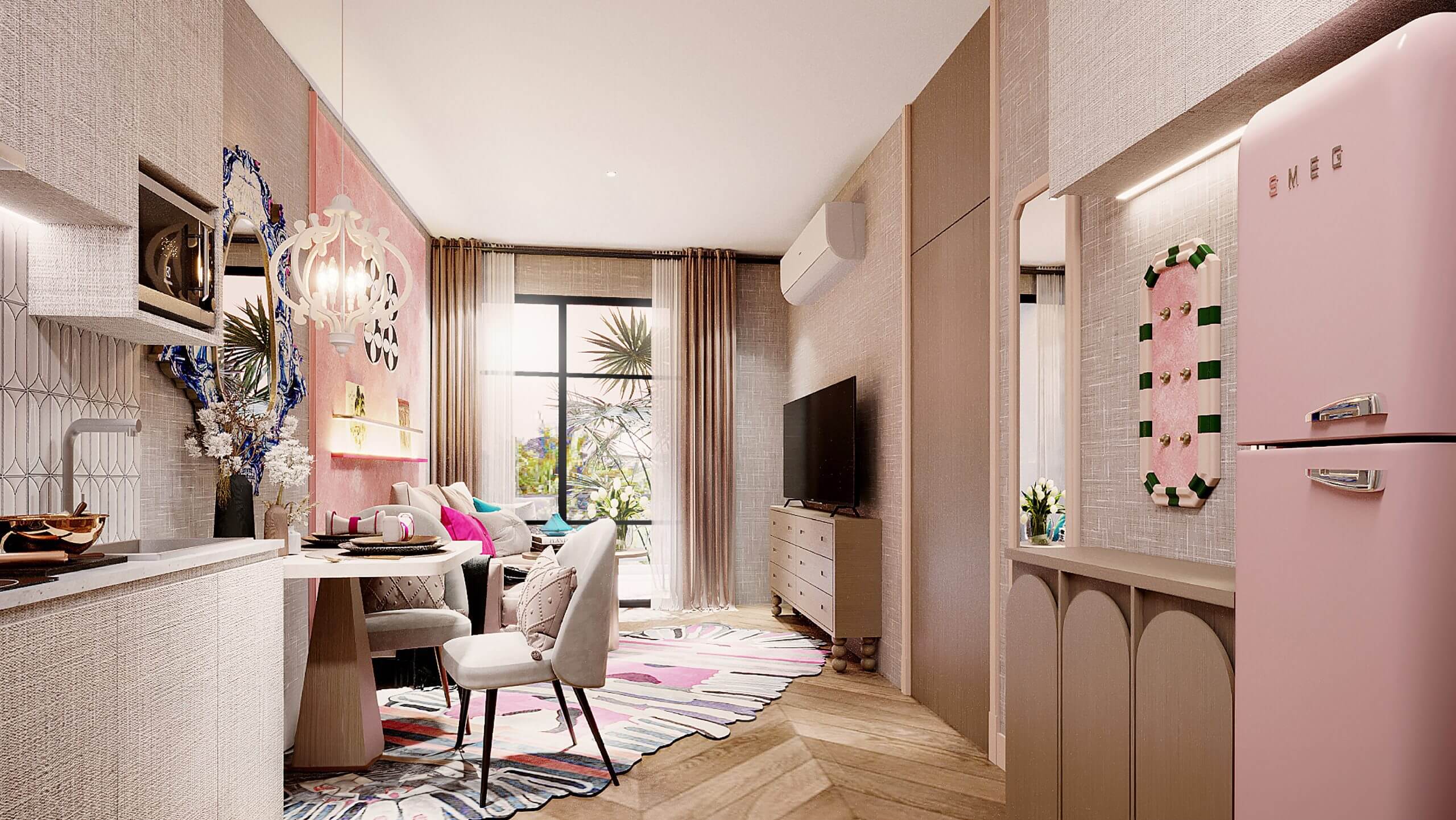 В апартаментах: квартири оформлені в елегантному середземноморському стилі з використанням теплих відтінків та натуральних матеріалів. Просторі кімнати, сучасна кухня та великі вікна створюють комфортний простір із видом на зелень та пейзажі.