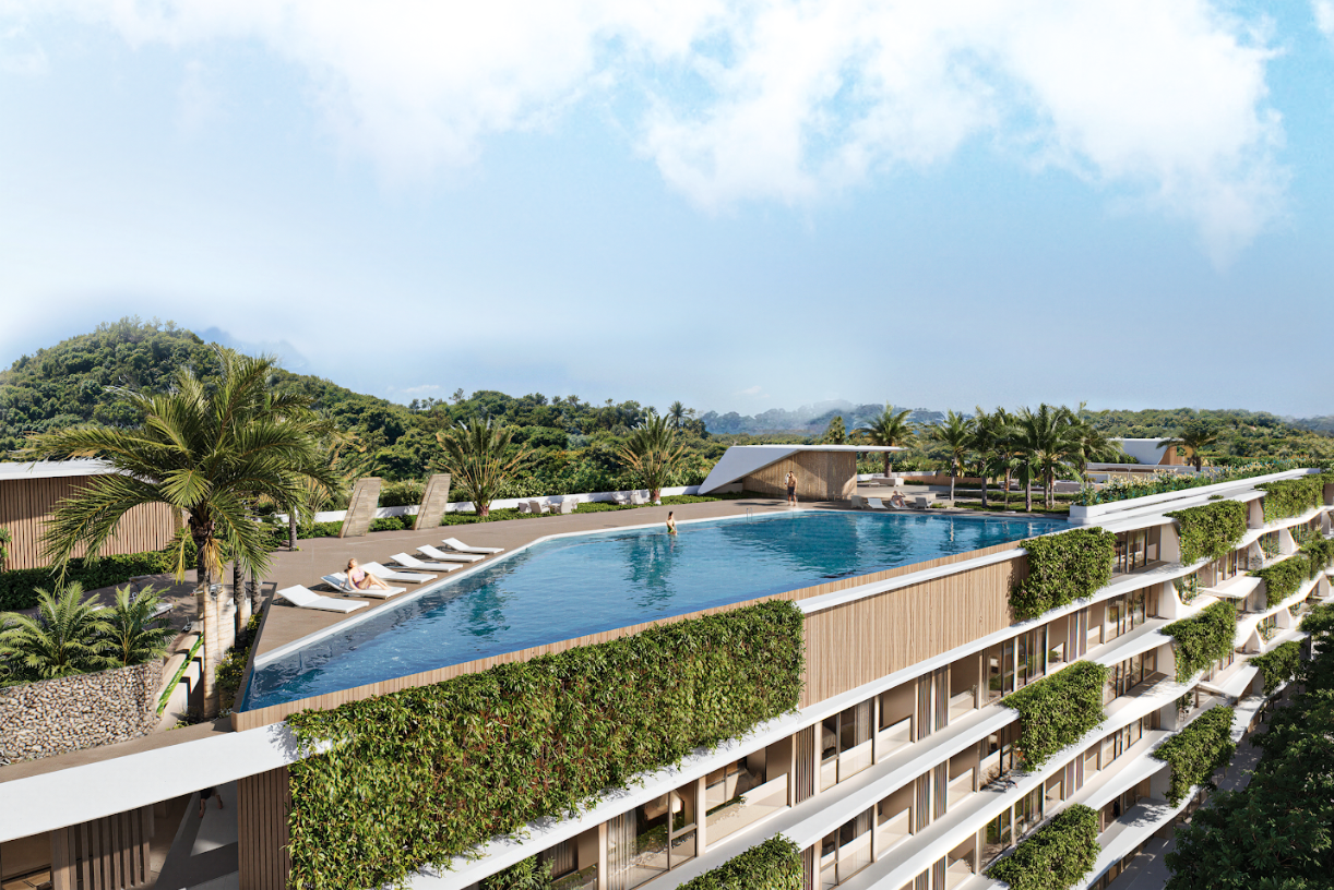 Інфраструктура: три інфініті-басейни, дитячий та дорослий басейни, міні-аквапарк, зал для йоги, ресторан, лобі, коворкінг, дитячий клуб, спа-салон, фітнес-центр, кінотеатр, зона відпочинку на даху та підземний паркінг.