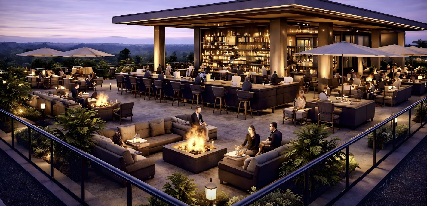 На території площею 11 000 м² розташована повністю інтегрована комерційна зона з кафе, магазинами, коворкінгом та конференц-залами.